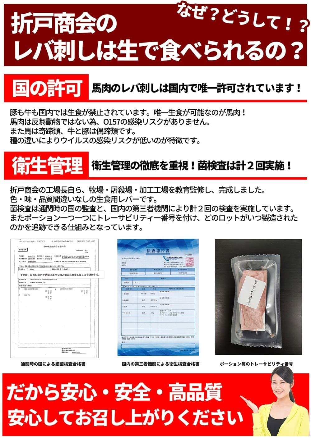 | 原材料 | 馬肝臓 レバ刺し専用タレ【水あめ、醤油、食塩、植物油脂、にんにく、香辛料/調味料(アミノ酸等)、酸化防止剤(ビタミンC)、酸味料、増粘剤(キサンタンガム)、ビタミンB1、(一部に小麦・ごま・ゼラチン・大豆を含む)】 |
